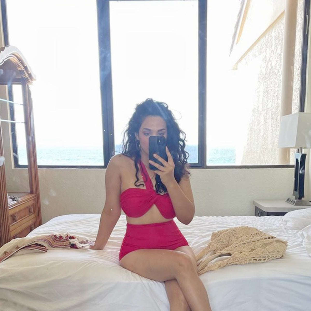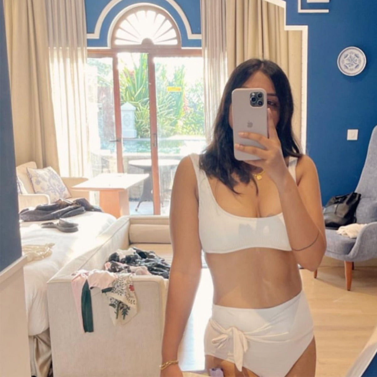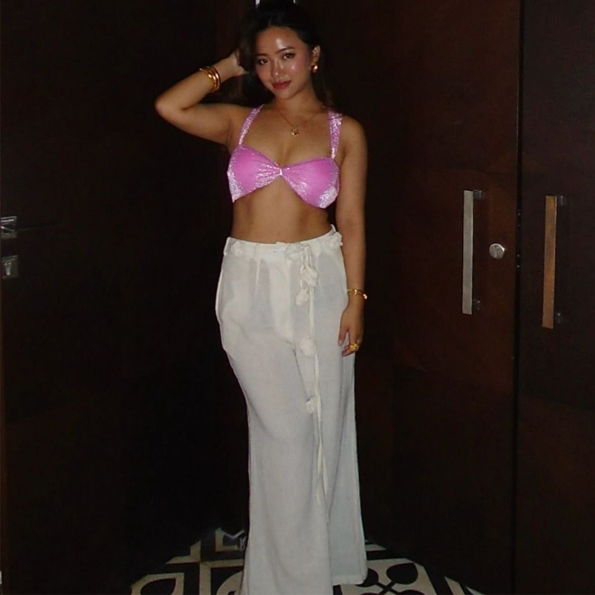 Our Founder spotted in White Tie Up Swim bottoms paired with our custom Floaty Swim top